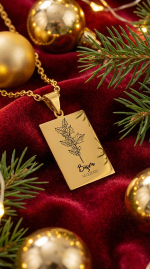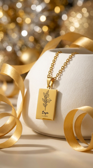 Bu özel tasarım kolye, her ayın kendine özgü çiçeğini sembolize eden ince çiçek illüstrasyonlarıyla bezendi. Yan kısmına işlenen isim ve tarih detayıyla tamamen kişisel bir anlam kazanıyor.