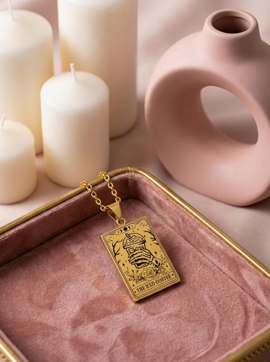 iced coffee kolye, buzlu kahve temalı çelik kolye, the iced coffee tarot kolye, altın çelik kolye kadın, gotik tarot takı, kahve severler için takı, kahve konseptli kolye, 316L paslanmaz altın kolye, Artinart kahve kolyesi, spiritüel kahve kolyesi, anlamlı sembollü kadın kolye