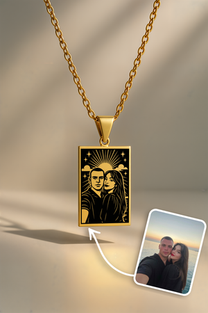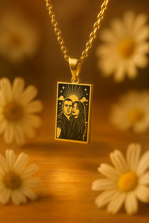 “Güneşin Altında Birlikte” çelik kolye, çiftlerin özel anlarını sanatla ölümsüzleştiren anlamlı bir tasarım sunuyor. Altın tonlarında zarif bir zincirle tamamlanan bu kolye, fotoğrafınıza özel olarak çizilen illüstrasyonla süsleniyor. Arka plandaki yıldızlar, güneş ışınları ve bulutlar; birlikteliğin gücünü ve sonsuzluğu simgeliyor.